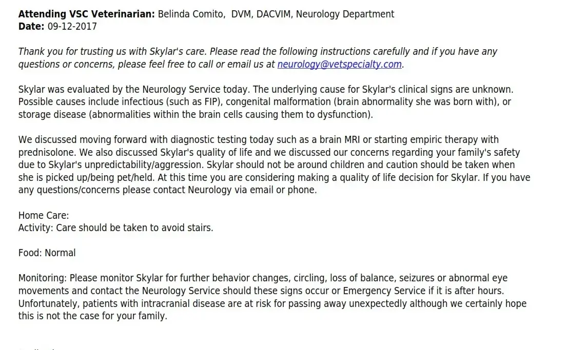 Again, because the veracity of my claims has been doubted, and because I have not been able to attach full pdf's of vets' reports, herewith is a screenshot summarizing Sky's 09.12.17 evaluation by Belinda Comito, DVM-Neurologist. This consult confirmed that the best decision for Sky's quality of life [which was marked by inability to ambulate, falling, anorexia, bloody stools, and violent outbursts], and for the safety of our grandchildren, was to euthanize her. After discussing this with my family members -- and many, many tears -- we all agreed it was the only path. She was euthanized on 09.14.17