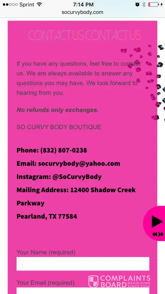 We found clear and detailed contact information for So Curvy Body. The company provides a physical address, phone number, and email, as well as social media account. This demonstrates a commitment to customer service and transparency, which is a positive sign for building trust with customers.
