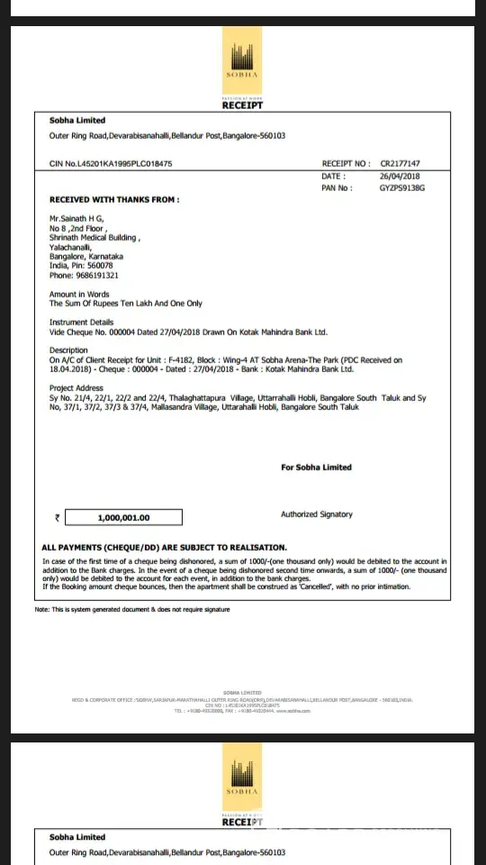 We had booked a 2bhk flat with Sobha Dream Acres on Dec 2, 2017, with an advance amount of 1 lakh rupees.