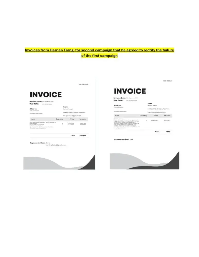 I am reporting an international service fraud involving misrepresented social media marketing services. I hired an individual and associated parties operating under the names Hernán Frangi, Marc Hall, and Sicronicidad LLC to provide professional social media marketing services for my business. The services were marketed as legitimate, organic engagement...