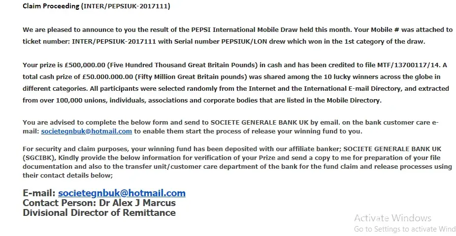 I want to ask, is that true or fake ? Is Societe Generale Bank UK keep my fund of Coca-Cola Prize ?