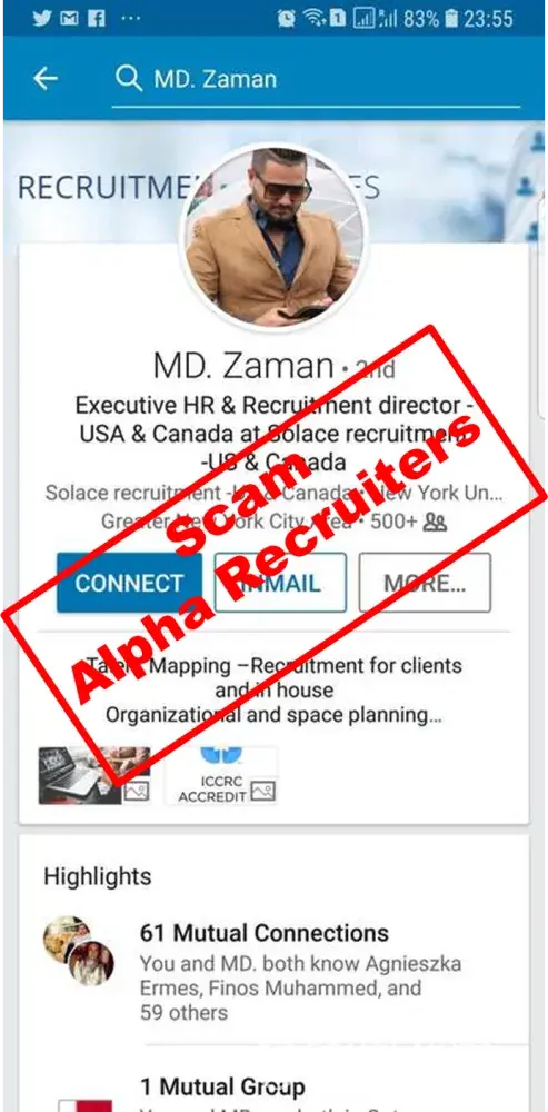 Mustafa Zaman is a fraud. Now he changed the name of the fake company from solace recruitment to alpha recruiters a fake company as well . We notified US and Qatar and UAE fraud bureau.