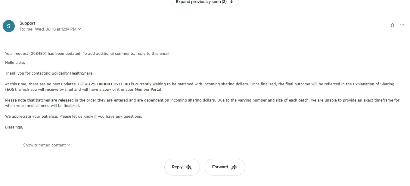 Once again, I am receiving a final notice and am being sent to collections from a provider that Solidarity assured me they were taking care of. I have sent emails and left voicemails over the last two weeks and have not gotten a response. The provider is requesting a payment of $2200 from me which Solidarity is responsible for. The services for this claim were in January. I don't fault the provider for wanting their payment that is 6 months overdue. The individual assigned as the 'manager' contact I was provided never responds to emails or voicemails. It is beyond frustrating to be penalized for the incompetence of Solidarity Healthshare.