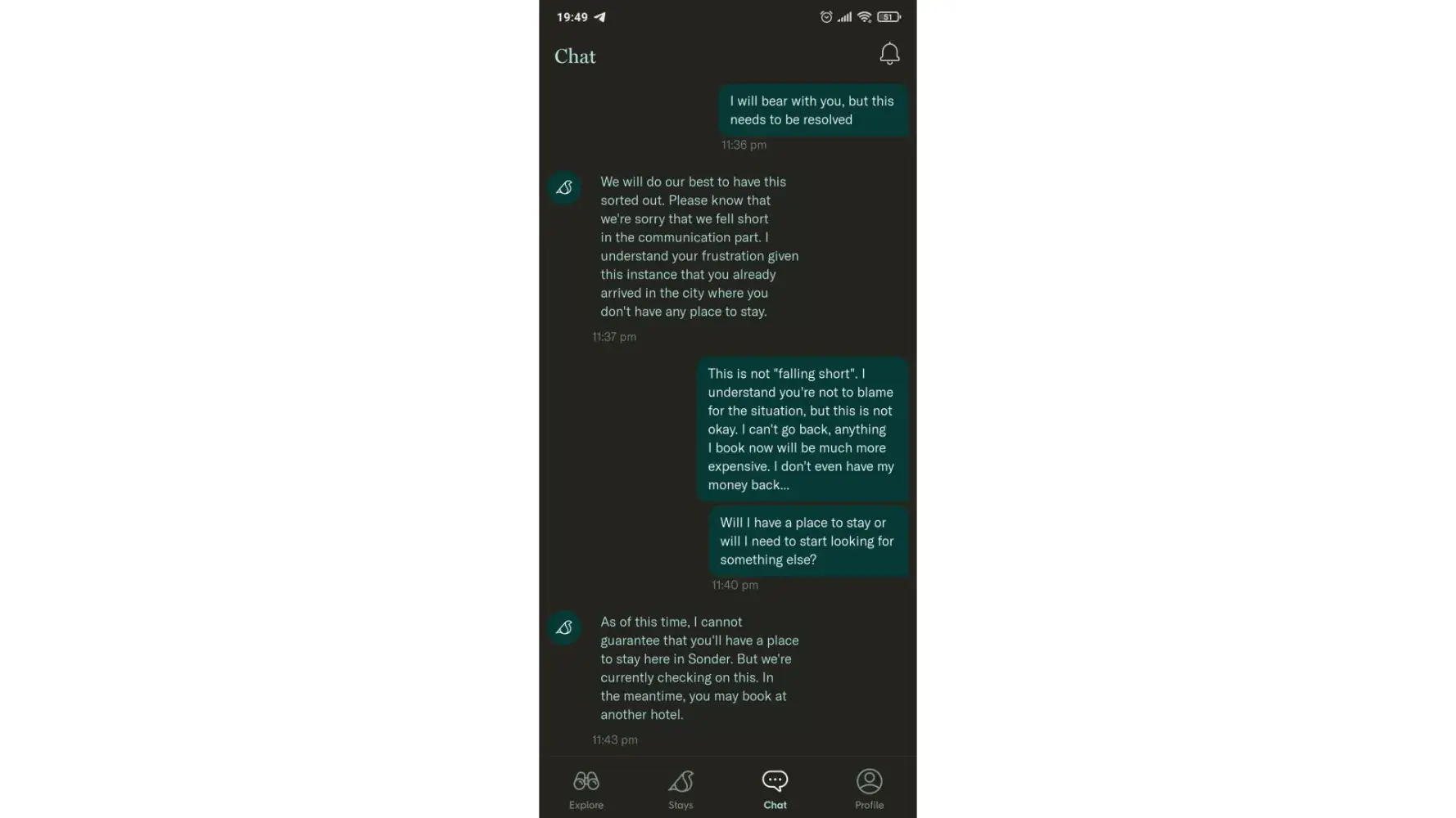 I started complaining. The key fact about this whole situation was that we DID NOT receive any email letting us know what had happened. I mentioned this in the chat, which I was told it was a mistake from their side. Basically, they cancelled our booking, our accounts, and didn't notify us of this happening. Had we not opened the application before our flight and we would've only learned the situation when trying to access the apartment.