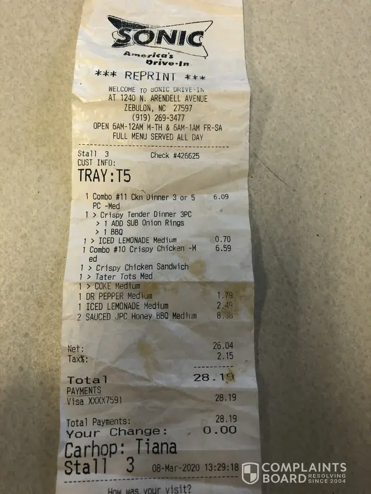 On Sunday May 3, 2020 I placed an online order using the Sonic App to the Sonic at 265 Mt. Holly-Huntersville Road, Charlotte, NC 28214.