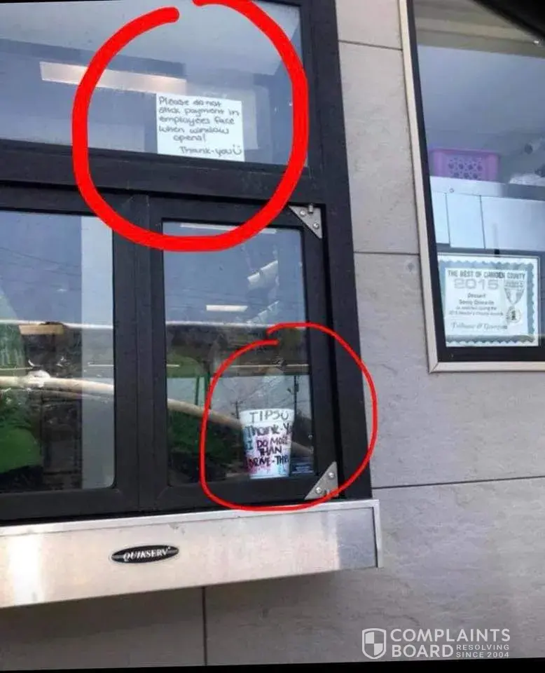 They have signs posted in drive thru window starting do not put money in cashiers face when she opens window also have a tio cup that says I do more than drive thru. My family and I stopped thru for burgers and shakes family of 4 my bill came to $28 and I was just shocked how long food took and how absolutely rude they were in drive thru then to see the signs..ridiculous they need an attitude adjustment there. I dont think I'll be returning even though i come through almost every day for a drink on my lunch break. Camden county ga st.marys