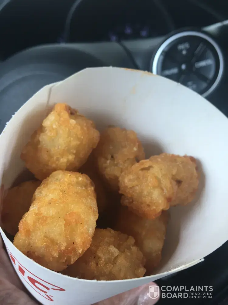 The chicken was not raw, but had texture of chicken that was JUST past raw, no pink. It was hard to bit into and texture was off setting and unappetizing. Tater tots were not crisp. I could not finish the chicken (which was slathered in mayonnaise), but did finish the tots.