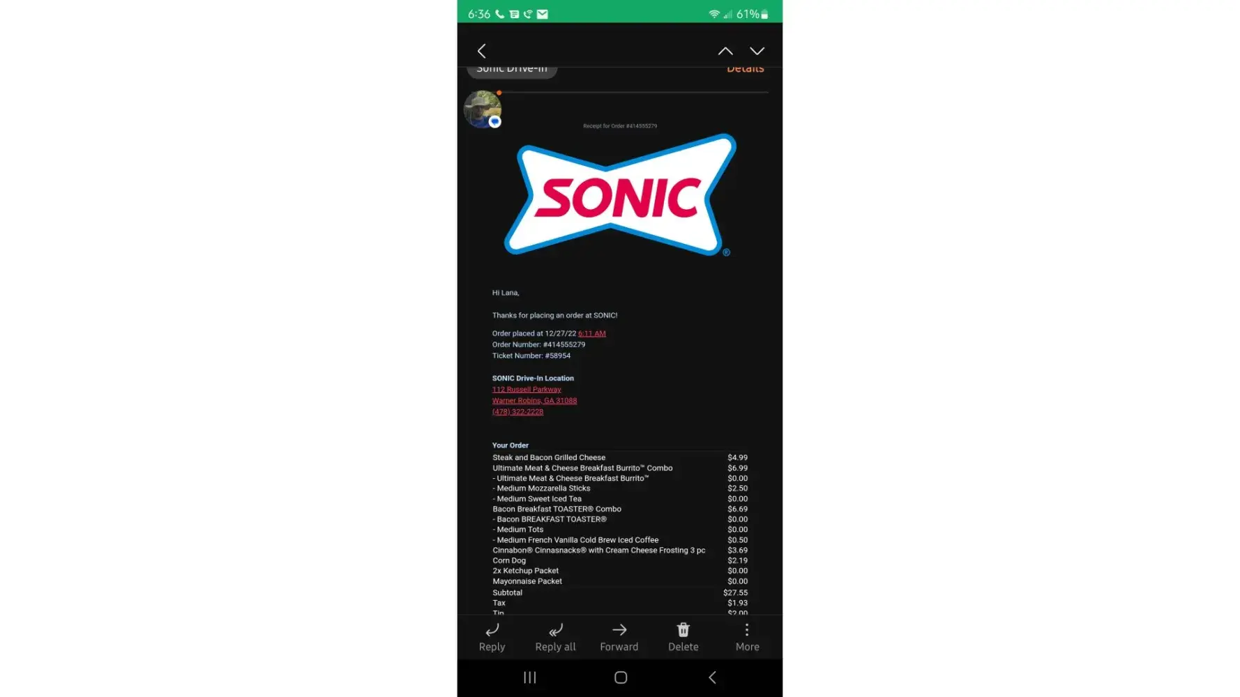My husband and my self went to Sonic for the special burger/chicken fries/and gift certificate for a Christmas gift if there was some way I could return the gift certificate without a purchase I would . We ordered our food and waited it said in kitchen so we waited then on the side of us two cars pulled up one on each side of our car well each of these cars received there order before us and they finished their food, and to top it all off the food we received was mildly warm my husband said we should complain I said never mind we waited long enough. Besides you can't complain the dinning room was closed ! What lousy service . My receipt was for Grand Army Highway in Somerset, Ma [protected]) November 18 2022 drive in 6542 ticket115136