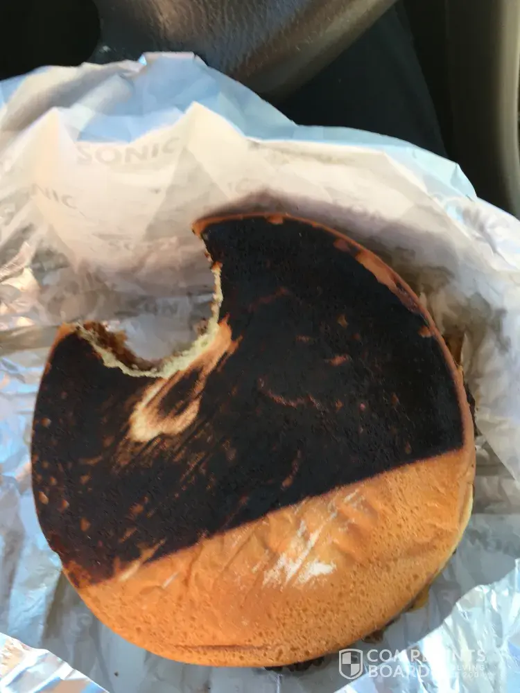 Sonic Drive-In hamburger bun and hamburger burnt to a crisp