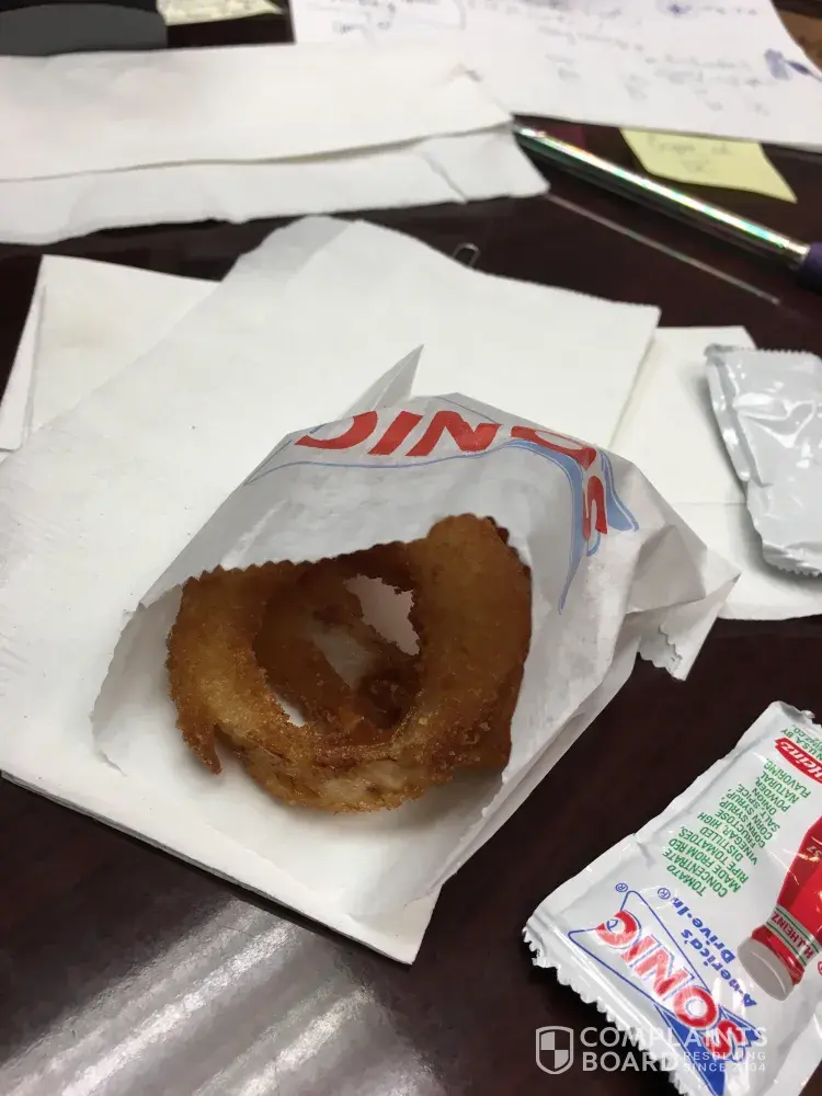 ok I just got back from my Sonic in Lewisburg, TN and ordered a corn dog and mini onion rings.. I knew that it wouldn't be a lot since it was a mini, but for a $1.19 I figured I would have more than 2 small onion rings in a little bag. I got back to my job and couldn't eat them for wanted to let everyone know this is what you get for a 1.20 for a mini onion ring.. All I want to say is that's a rip and sure makes me ill..