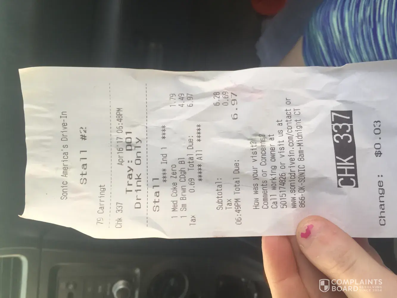 On 3-8-17, i went to sonic on 1484 n hampton, desoto tx 75115.