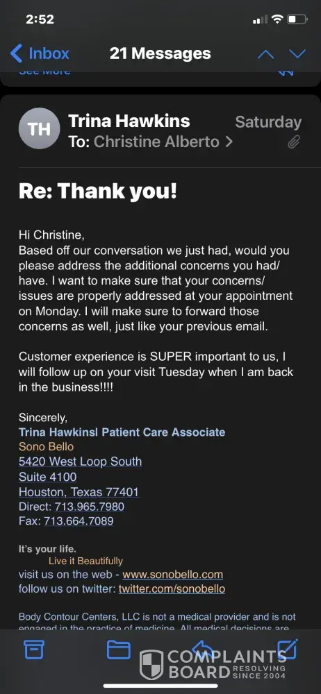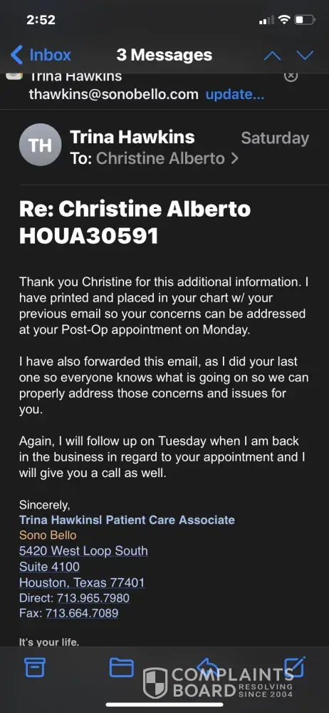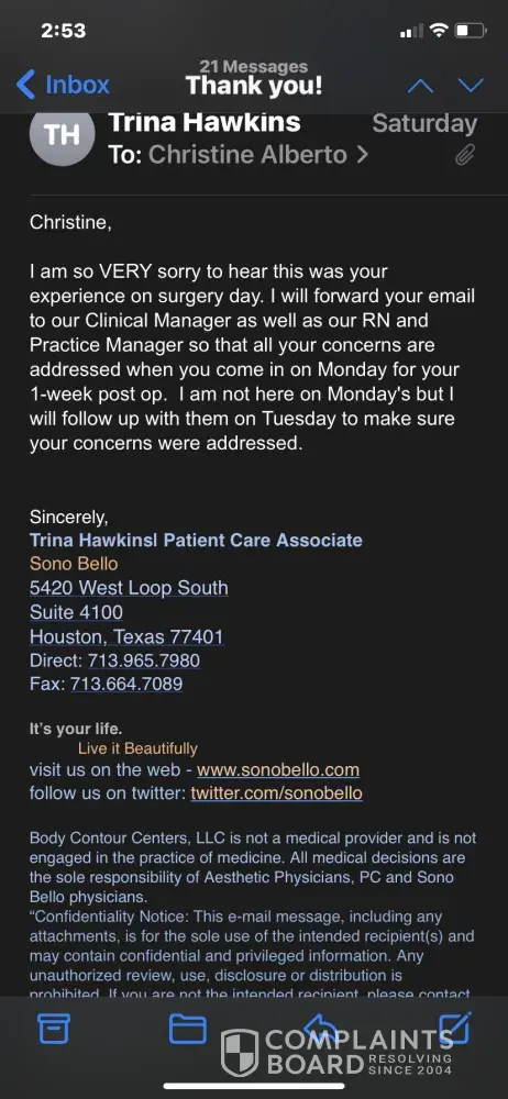 You do understand this website is just a place for people to complain about any company, not just Sono Bello. The company isn’t going to respond to you here