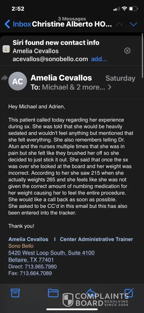 Hello I was due to have a procedure with Sono Bello, the made an appointment for me to have my pre op the day before my surgery and said I had to pay in full. They requested information via text message more than once. They charged my husbands card 3-4 times saying it wasn't working. The day of pre op I met the doctor and the experience was horrible. I...