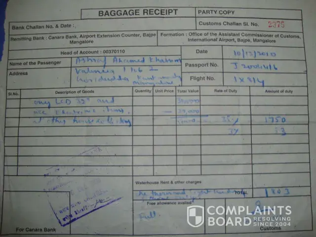 On 10th Dec 2010 I travelled from Dubai to Mangalore by AirIndia Express (IX814). I purchased a 32" Sony LCD from Dubai. In Dubai Sales man told that 32" TV is Duty free, but in Mangalore airport customs officer they ask to pay Rs. 8000/- for that. I purchased TV for Dhs. 1499/-. which is around Rs. 18000/-. More that 3 hours they argue with us. I refuse to pay Rs. 8000/- and told that I'll complaint about this . The custom officer Mr. Damodaran behave very rood with us. He used bad words and harassed a lot. I was travelling with my wife, my mother (60 +) and 40 days baby. After a long arguement he made challan - in which he mentiond LCD, used electronic(my old laptop, my mobile) and house hold items. Where as he is not suppose to charge for mobile and house holds. From Rs. 8000/- how he made challan for Rs. 1803/- ?