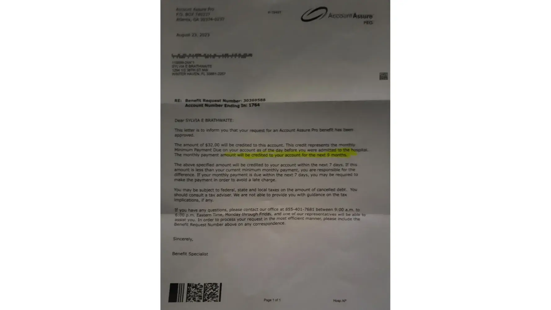 They sent me 2 approvals, and neither one satisfied the balance of the account. I was in the hospital recovering from surgery from February 7th through February 17th. All of my Synchrony accounts were satisfied because of the hospital stay of 10 days. Sony has given me the run around, and that's not right.