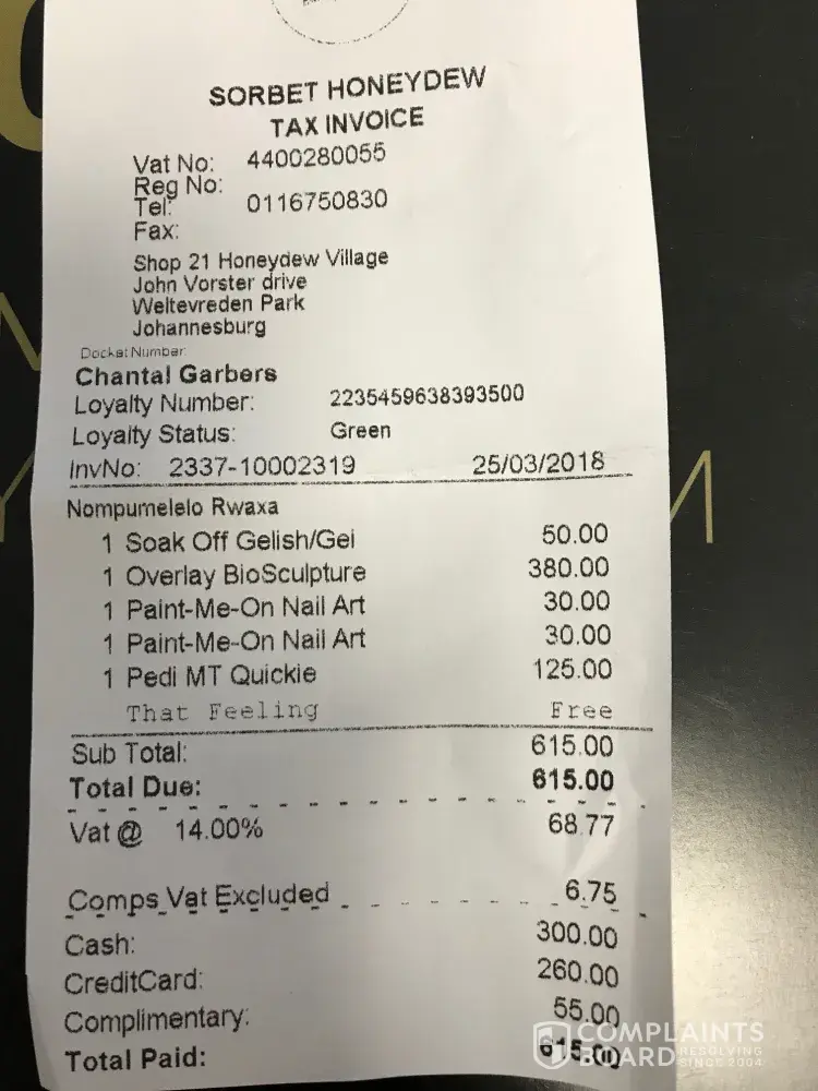 Walked into a pavilion branch in Durban under 2 weeks ago, excited about my first gel application friends and family bragged to me about Sorbet now money Is NOT the issue I walked in with my sister and now both of our nails hac cracked and the sorbet gel has started peeling off? I'm not sure if this is the quality I should be receieving as a first time customer?! I will attach pictures if need be . I am highly dissapoinfted as I wanted to try out Sorbets acrylic tips and a pedicure as my birthday is this month however I'm no sure if I will be able to reccomed sorbet to anyone after this incident. Regards Chevonne.