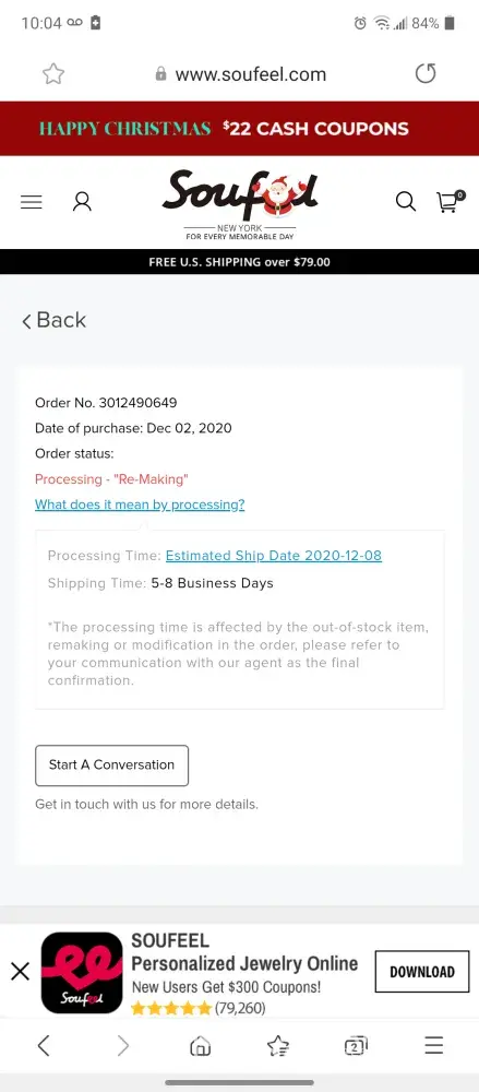 I place and order on December 6th, 2019. It was for 4 items, I paid the $23.95 extra for shipping for it to be here faster. I kept tracking my.order and the ship date kept being changed to later, then when I emailed them they said one of the items had to be remade and that was before Christmas. It's been a month since I place the order, this is ridiculous, I want the money back that I spent extra on shipping. My stuff was supposed to ship January 4, 2020 now its saying January 12, I want the stuff I ordered or I want a COMPLETE refund because this just seems like a complete rip off.