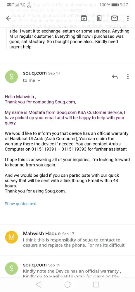 I trust souq, I want them to collect and solve the problem by there own, and replace my mobile.