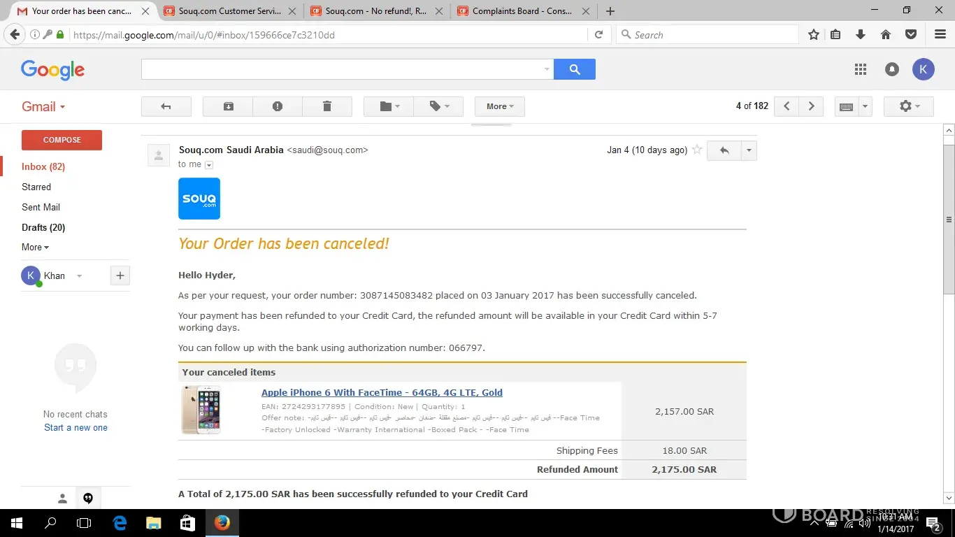 I had paid for an iphone 6 with facetime at souq.com in saudi arabia (order number: [protected] placed on 03 January 2017). Then i immediately cancelled in 1-2 hours before the item was shipped. I recieved a confirmation email that the money has been refunded back to my credit card and will be available to me in 5-7 days. But It's almost 2 weeks now but NO REFUND. I sent an email to souq.com asking for my refund, but there is no reply from them. When will i get my money back ?