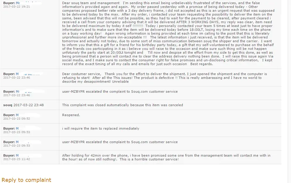 user-MD3H4R escalated the complaint to Souq.com customer service