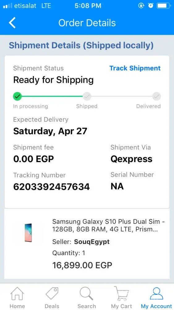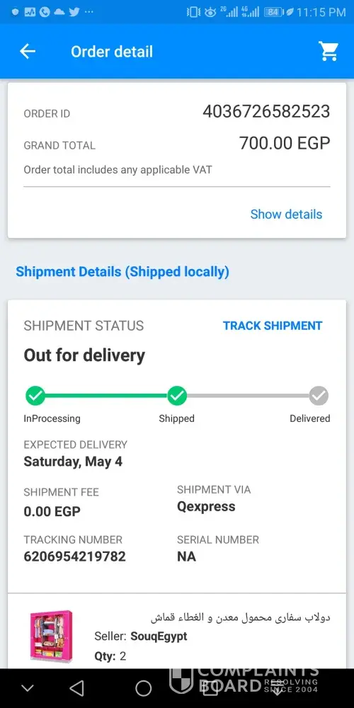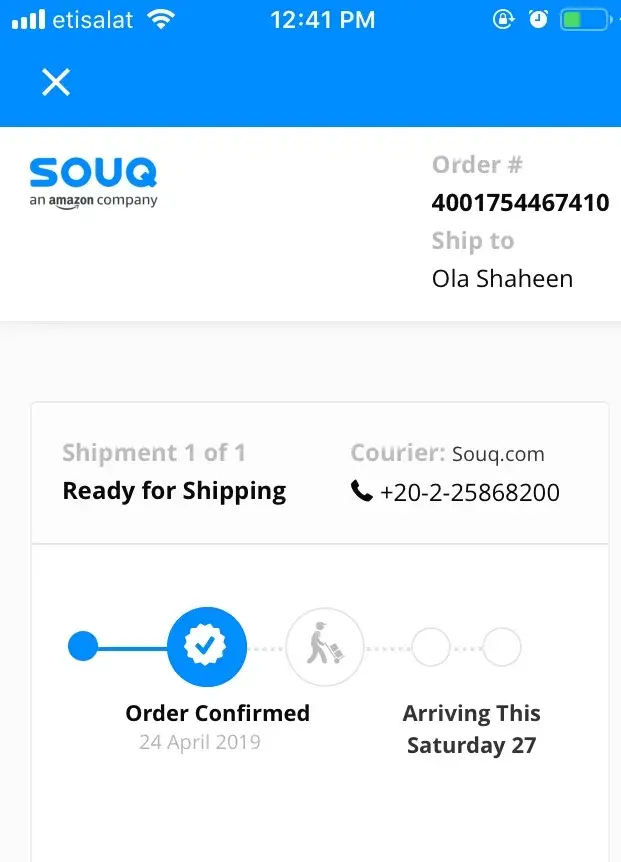 2nd the address is wrong so please connect souq. Com not the shipping to confirm iam call souq and they confirmed on address as per address on application so we make a ticket and the order will deliver tomorrow for sure noting that iam received 3 msg that the couriers on way on 5 may / Tuesday 7 may and today