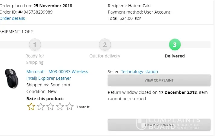 Customer service personnel name: Sohayeb Mohamed. (very rude - not Egyptian)