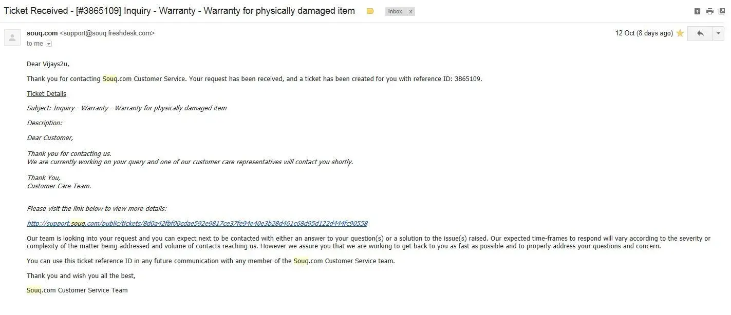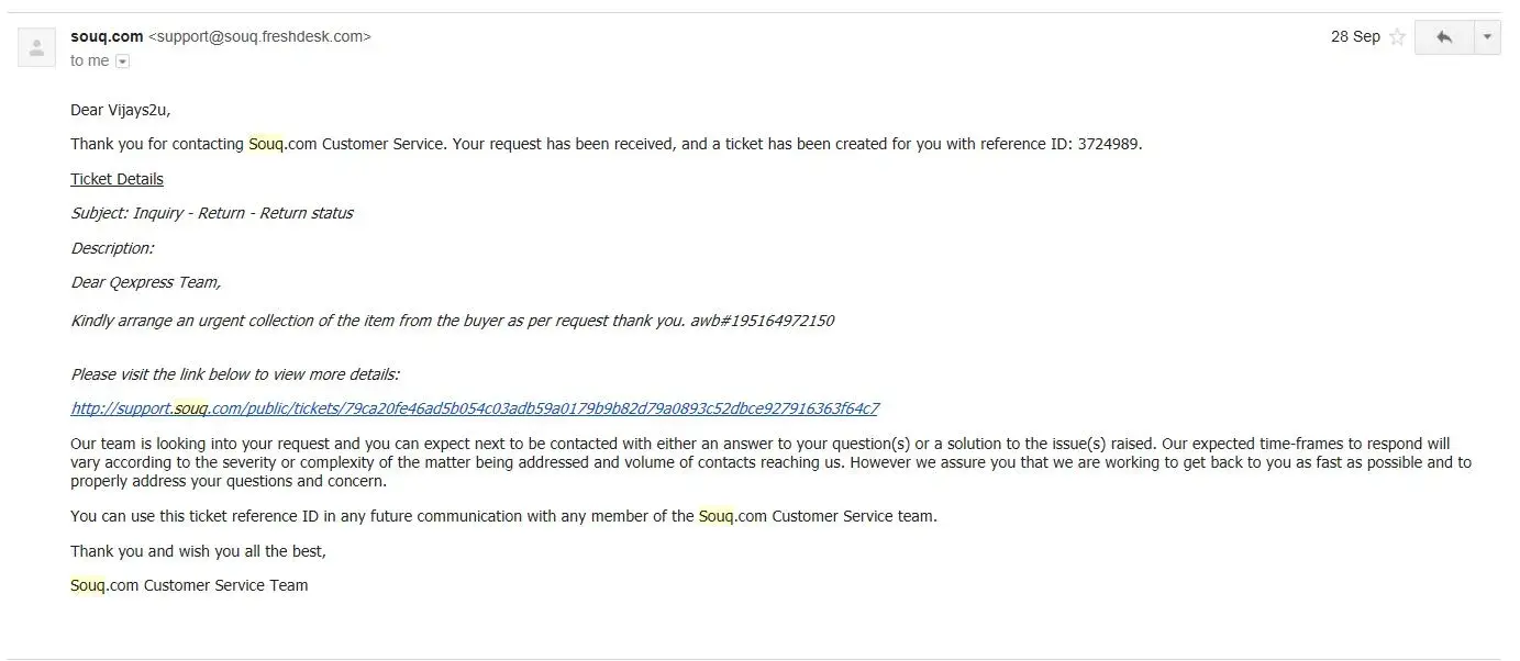Sent from my iPad Begin forwarded message: From: Mayank Date: 2 November 2015 at 8:07:10 PM GMT+4 To: "souq.com" Cc: [protected]@gmail.com Subject: Re: Ticket Received - [#3979337] Complaint - Return - Technical issue How is this ticket closed even after so many reminders and calls and promises to collect from your end, please reopen and collect defective item Sent from my iPad On 02-Nov-2015, at 8:04 PM, Mayank wrote: Reminder Sent from my iPad On 01-Nov-2015, at 10:42 PM, Mayank wrote: Still await collection between 1400 to 1700 hrs. Sent from my iPad On 30-Oct-2015, at 11:54 PM, Mayank wrote: Reminder Sent from my iPad On 30-Oct-2015, at 12:49 AM, Mayank wrote: Still await collection Sent from my iPad On 26-Oct-2015, at 7:47 PM, Mayank wrote: Still await collection no contact done by courier for collection Sent from my iPad On 25-Oct-2015, at 8:40 AM, souq.com wrote: Dear Mayanksharmadehradun, Thank you for contacting Souq.com Customer Service. Your request has been received, and a ticket has been created for you with reference ID: 3979337. Ticket Details Subject: Complaint - Return - Technical issue Description: Dear Customer, Thank you for contacting us. We are currently working on your query and one of our customer care representatives will contact you shortly. Thank You, Customer Care Team. Please visit the link below to view more details: http://support.souq.com/public/tickets/14ae4df32c397754c305248f0beb45e467543c05569477127c9712813ca2ea8a Our team is looking into your request and you can expect next to be contacted with either an answer to your question(s) or a solution to the issue(s) raised. Our expected time-frames to respond will vary according to the severity or complexity of the matter being addressed and volume of contacts reaching us. However we assure you that we are working to get back to you as fast as possible and to properly address your questions and concern. You can use this ticket reference ID in any future communication with any member of the Souq.com Customer Service team. Thank you and wish you all the best, Souq.com Customer Service Team 3979337 Sent from my iPad Begin forwarded message: From: "souq.com" Date: 20 October 2015 at 11:33:53 AM GMT+4 To: [protected]@gmail.com Subject: Ticket Received - [#3939954] Inquiry - Return - Return status Reply-To: "souq.com" Dear Mayanksharmadehradun, Thank you for contacting Souq.com Customer Service. Your request has been received, and a ticket has been created for you with reference ID: 3939954. Ticket Details Subject: Inquiry - Return - Return status Description: Buyer called for return update Please visit the link below to view more details: http://support.souq.com/public/tickets/ee10ef3772d89f8b97034357c86935336376bd853f5923f7d25bfa80d8c612ba Our team is looking into your request and you can expect next to be contacted with either an answer to your question(s) or a solution to the issue(s) raised. Our expected time-frames to respond will vary according to the severity or complexity of the matter being addressed and volume of contacts reaching us. However we assure you that we are working to get back to you as fast as possible and to properly address your questions and concern. You can use this ticket reference ID in any future communication with any member of the Souq.com Customer Service team. Thank you and wish you all the best, Souq.com Customer Service Team 393995 Sent from my iPad Begin forwarded message: From: "souq.com" Date: 20 October 2015 at 11:33:53 AM GMT+4 To: [protected]@gmail.com Subject: Ticket Received - [#3939954] Inquiry - Return - Return status Reply-To: "souq.com" Dear Mayanksharmadehradun, Thank you for contacting Souq.com Customer Service. Your request has been received, and a ticket has been created for you with reference ID: 3939954. Ticket Details Subject: Inquiry - Return - Return status Description: Buyer called for return update Please visit the link below to view more details: http://support.souq.com/public/tickets/ee10ef3772d89f8b97034357c86935336376bd853f5923f7d25bfa80d8c612ba Our team is looking into your request and you can expect next to be contacted with either an answer to your question(s) or a solution to the issue(s) raised. Our expected time-frames to respond will vary according to the severity or complexity of the matter being addressed and volume of contacts reaching us. However we assure you that we are working to get back to you as fast as possible and to properly address your questions and concern. You can use this ticket reference ID in any future communication with any member of the Souq.com Customer Service team. Thank you and wish you all the best, Souq.com Customer Service Team 3939954 Sent from my iPad Begin forwarded message: From: Mayank Date: 19 October 2015 at 10:29:24 PM GMT+4 To: "souq.com" Cc: [protected]@gmail.com Subject: Re: Ticket Closed - [#3925680] Negative Feedbak - Order ID: [protected] - Seller:cellsafe - Marketplace Dear Sir/Madam, The article was supposed to be collected by courier today between two and five pm as per my telephone conversation with customer care yesterday but sadly the courier is calling me at ten am in morning when I am not there or anyone from family also not there .So please arrange for courier to collect and return between two and five pm Thanks Mayank Sent from my iPad On 19-Oct-2015, at 1:28 PM, souq.com wrote: Dear Mayanksharmadehradun, Thank you for contacting Souq.com Customer Service. As we have not heard from you for a while; we hope that our solution and response has met your expectations. Hence we are closing the ticket. Ticket Details Subject: Negative Feedbak - Order ID: [protected] - Seller:cellsafe - Marketplace Description: Feedback Comment: Item does not work as described Item Info: Title: Mini 5 Port 1080P Video HDMI Switch Switcher Splitter with IR Remote lym C1183 Price: 3066 EAN: [protected] Offer Note: Buyer Info: Nickname: Mayanksharmadehradun Seller Info: Nickname: cellsafe Response sent: Please visit the