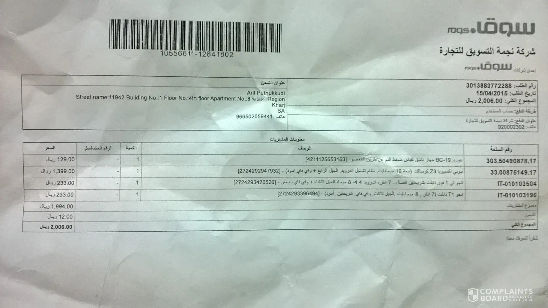 I ordered 4 items (Injoo tab white-1pc;Injoo tab black-1 pc; Sony Xperia Z3 compact-1 & Presure cheker. 1pc) and I get only two items Injoo white tab & Presure checker. Other two items ( Z3 compact & Injoo black tab) not get me. I open the parcel the injoo black tab box is emty Z3 not available. Immidiatly I call the delivery man but he switched off his mobile after that I call Souq support and they tell dontworry please open website and register the complant. So I register the complaint but they are not give any update and close the complaint again I call Souq support and I register the complaint but not give any update also complaint close. So please help me to get my item because its valuable item around 1600 SAR