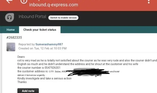 Hi. I would like souq.com to know that your shipping partner Q-Express (which is a Souq.com group company) does not answer customer calls. I called them on [protected] which is the number mentioned in their notification SMS and on their website. No one picked up the call for 30 minutes and then I hung up. Here is the video: https://www.youtube.com/watch?v=MZG6_a2s5-Q This was my 3rd attempt at trying to contact them. First was at 7:30pm the day before when i received the SMS notification. Then at 8pm. Then at 3pm today.