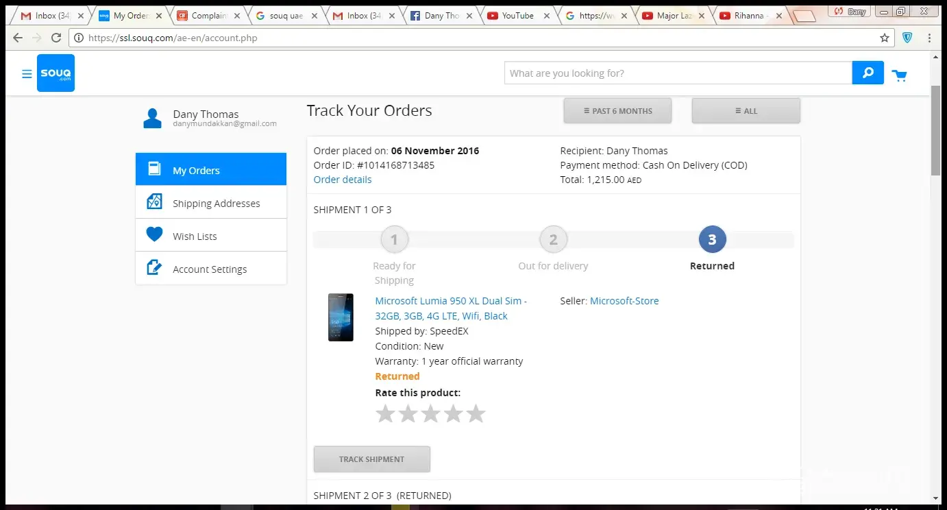 I purchased Samsung Galaxy Note 8 on souq.com on June 6, 2018. I didn't receive the item on the projected delivery day (June 9, 2018). However, on the tracking it says "delivered". I filed complaint online and received auto reply saying they will get back to me soon. However, I did three complaints and two escalations but no body reply me. Even I made three phone calls, and no one is willing to resolve the matter. I regretted to do purchase on souq.