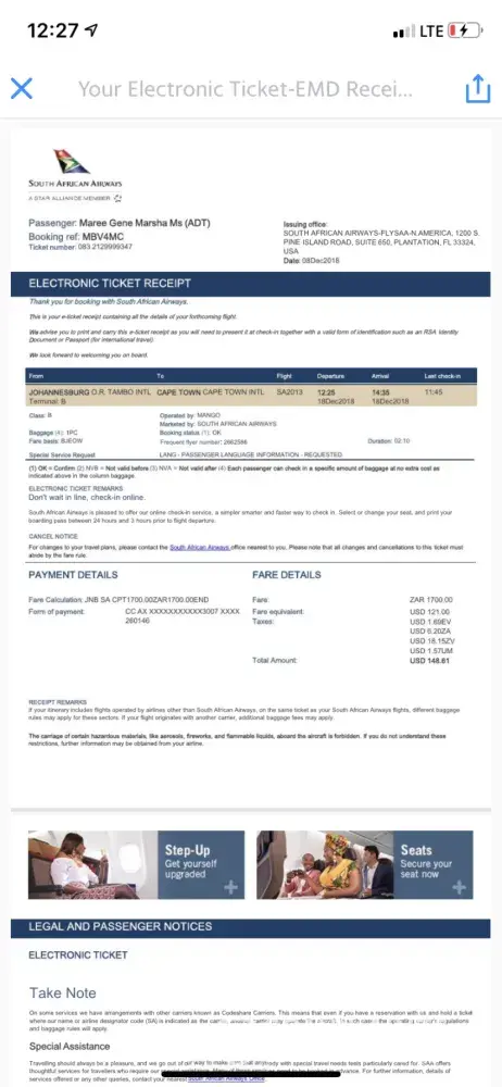 Find below tickets issued with South African Airways,
