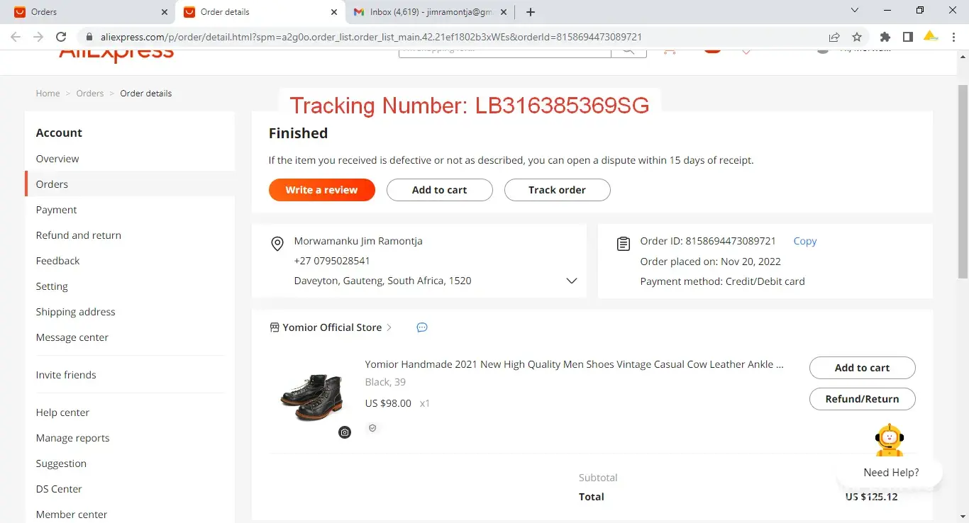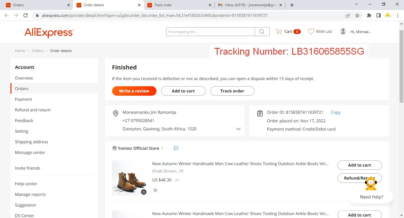 Parcel 2: Order ID: [protected], Tracking Number: LB316385369SG