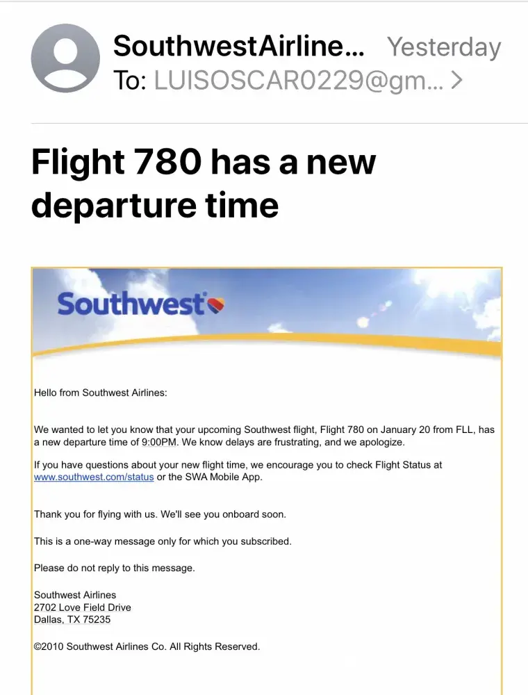 Twice you have changed my flights and I wasn't even notified about one change. Had I wanted those flights I would have taken those options. Who the f wants to get to the airport at 330 in the morning. I made these reservations 3 months prior. Last time taking SWA! People, if items are missing from your luggage after a flight file a claim immediately as the window is only 3 hours to do so