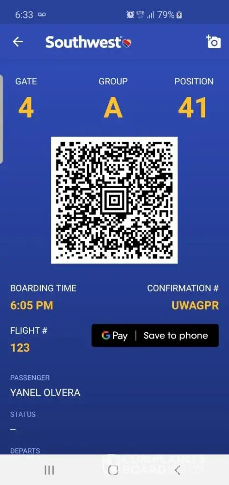 This complaint is in regards to flight 123 leaving San Diego airport in route to Dallas Texas scheduled for departure at 6:30 p.m. on 8/9/2019, in which it got delayed 2 hours. I receive notifications and the last notification I got was 8:50 p.m. I, Yanel Olvera, arrived at San Diego Airport at 8pm in which they would not let me get through the security checkpoint because the plane was taking off at 8:15 p.m.