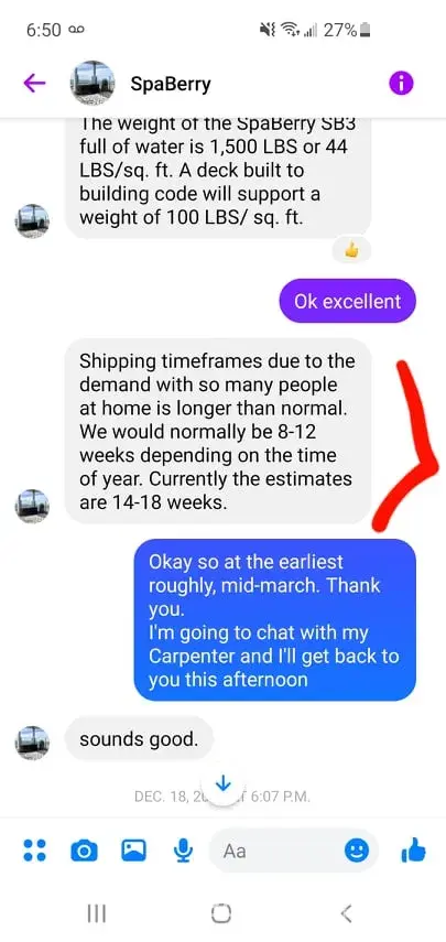 Finally after 9 months we asked when the hot tub would be here and he said for a 3rd time 2-3 weeks.