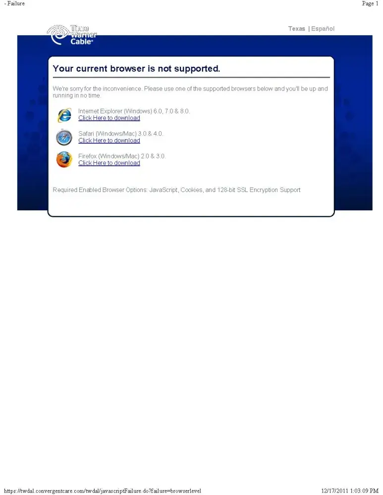 Time Warner Cable's PayExpress is not working properly. When one attempts to logon to pay their bill online, a screen pops up stating that the customer must upgrade their browser. In my case I am using the latest IE Browser available, and I have two other browsers, Opera, and Mozilla which are also the latest versions. I am unable to go past this screen. I called Time Warner Cable to pay my bill via phone and informed them about this problem. The representative claimed they had received many complaints to this regard. This was December 14th. Today is December 17th. They have fixed the problem.