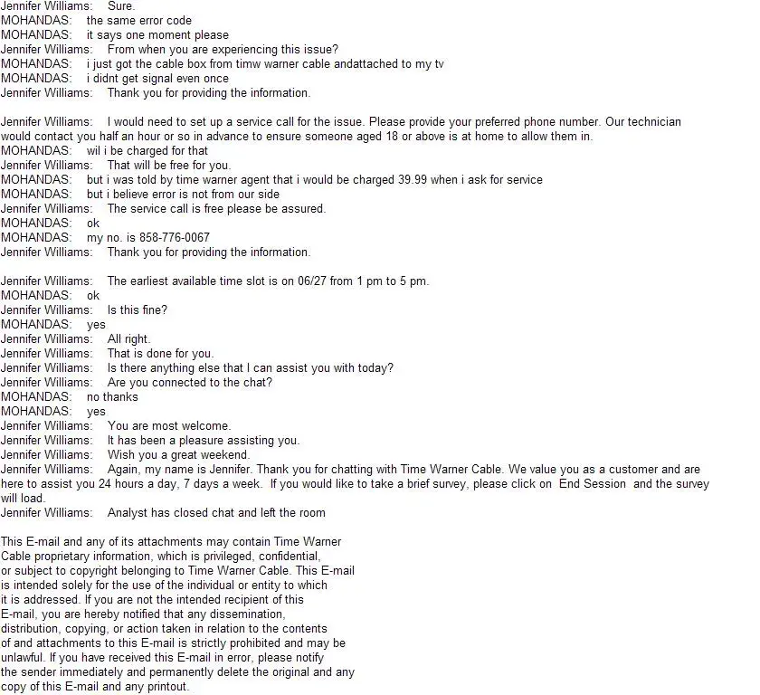 We had ordered for Time Warner Cable about 2months back. The Equipment they provided was faulty and we had mentioned the same to them. The sent a written communication that they will send a technician for the repair which will not be charged to us. Now I see the bill and see a $40 charge for the technician Service.