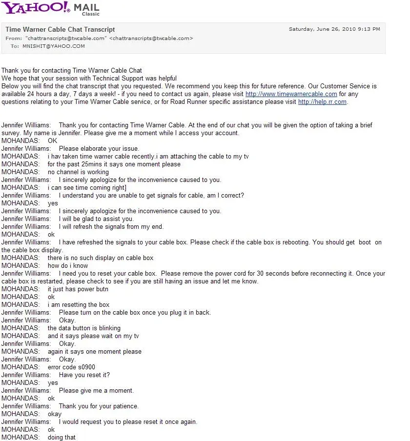 It’s very frustrating to pay for services that seem to work only when they feel like. After you call and complain so many times about the interruptions in your services they will offer you something useless like three months free of Showtime, which is nice if you like watching Weeds or The Big C. From the experiences of myself and other people I know on Time Warner I would rate the service 4/10 and the support 2/10. If you have an option of going with a different provider I would strongly recommend it as the odds are it will be superior in every way shape or form.