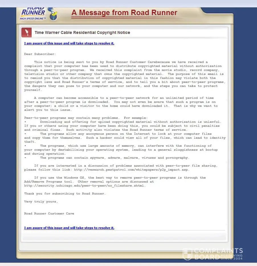 Look like Time Warner Cable/Road Runner has some of there own spyware running and may even be in some snoopping vialation thereself. Sure they provide the internet but should not be watching what you are doing. I am sure it is the one providing the information to the "Movies Makers" which is in turn complaining to them. That what happen when the "Time Warner" own "the movie and internet sharing it.