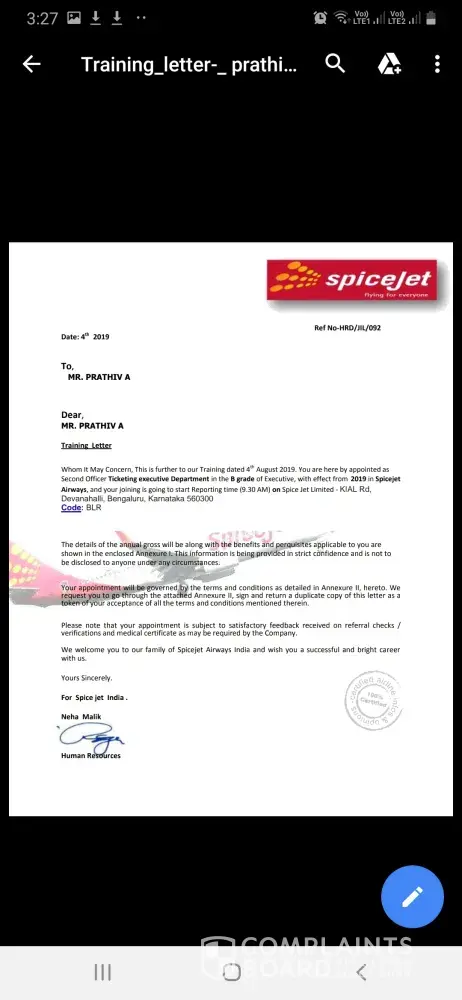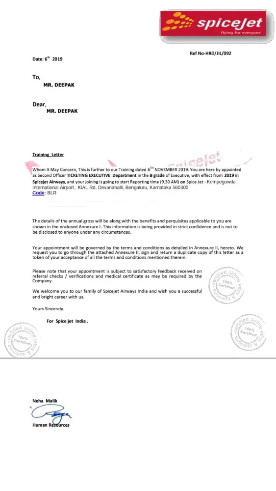 Ms Neha Malik called me for interview in spicejet Airlines she told me that she is senior HR in spicejet Airlines First she told me to pay for the registration fees 1500rs later she send me a refund letter and later she asked me to pay 5200rs for training purposes after few mins she send me a confirmation letter. And again she called me to pay 2450rs she told me that she is working in Bangalore international Airport and she told me to come in the morning around 8:30am waited for long time she is a fraud dont ever pay any money in online