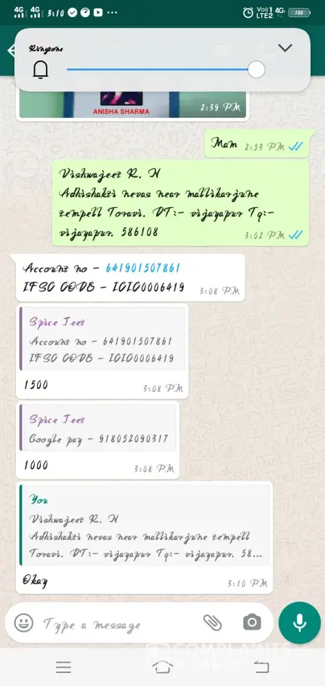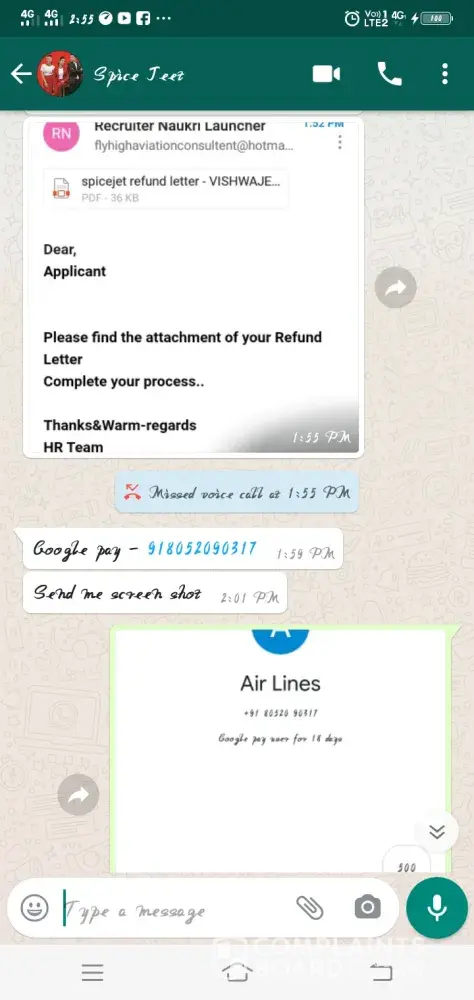 Please help me get my money back I am big trouble right now. A lady called me and said that I've got shortlisted for job in Spicejet Airlines and asked me pay 1860/- for proceeding with interview process and conducted an online test. Then next day they conducted a telephonic interview who is claiming himself as Aryan Singh Lead HR and from Spicejet headquarters and said that I've selected and if I'm interested to join then I've to pay 8500 /- for gate pass which will be refunded within 7 days. After payment I got to know that it's all fake and I asked for a refund. Now she is saying that it'll take 90 working days without any proper information. Please help me to get my money back. I am in big emergency right now. I've even asked for the proof of payment then they've sent me a receipt which is not so convincing.