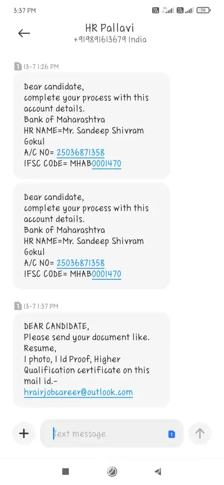 I got call from HR EXUCATIVE Anisha sharma for customer exucative post she shared I'd latters for fees registration, medical, uniforms totaly I paid 15, 500 to her I took money with money lenders. With