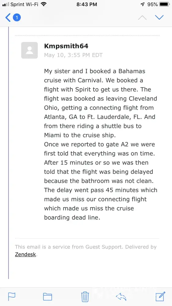 My sister and I booked a flight with Spirit Airlines. We were to board flight NK241, gate A2 at 5:20 a.m. We were to fly a connecting flight in Atlanta GA, flight NK1077, gate D4 at 7:56 to Fort Lauderdal arriving at 10:40a.m. and from there ride a shuttle bus to Miami FL to the Carnival cruise ship.