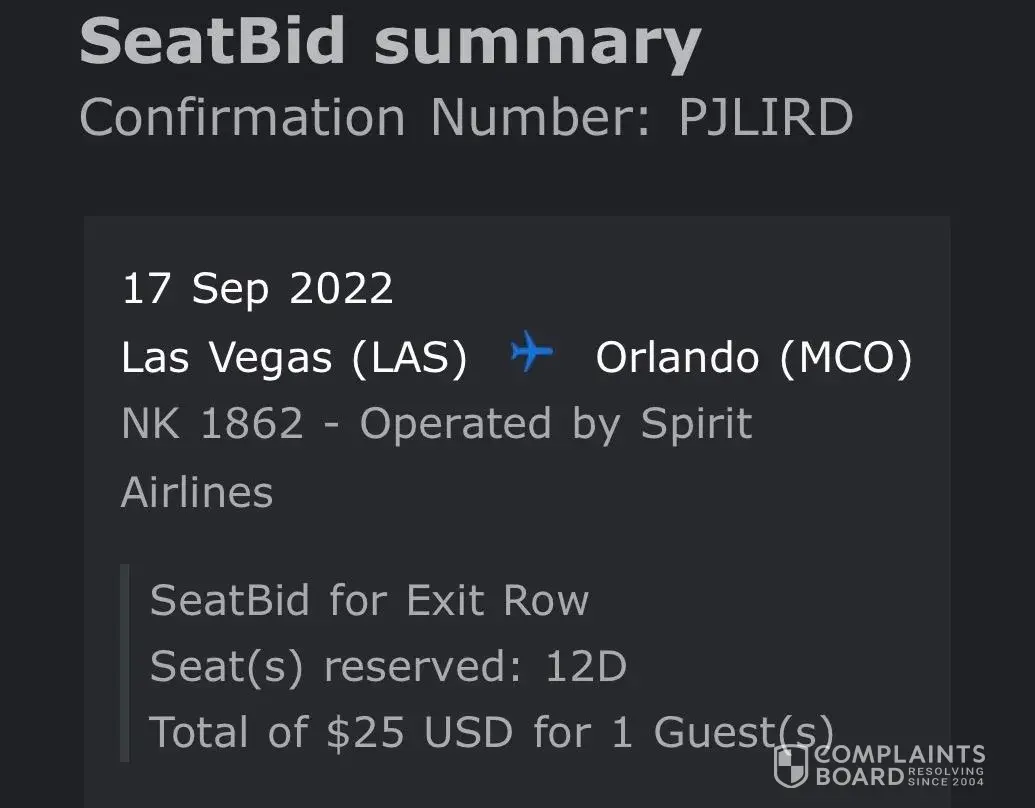 This is regarding confirmation: PJLIRD from 9/17/22 from Las Vegas to Orlando. I purchased a seat for $35, and then the morning of the flight, I received notification that I received a flight bid for an exit row seat for $25. I explained the situation to the ticketing agent, and she said that I would not receive both charges. I did, and I was doubled charged.