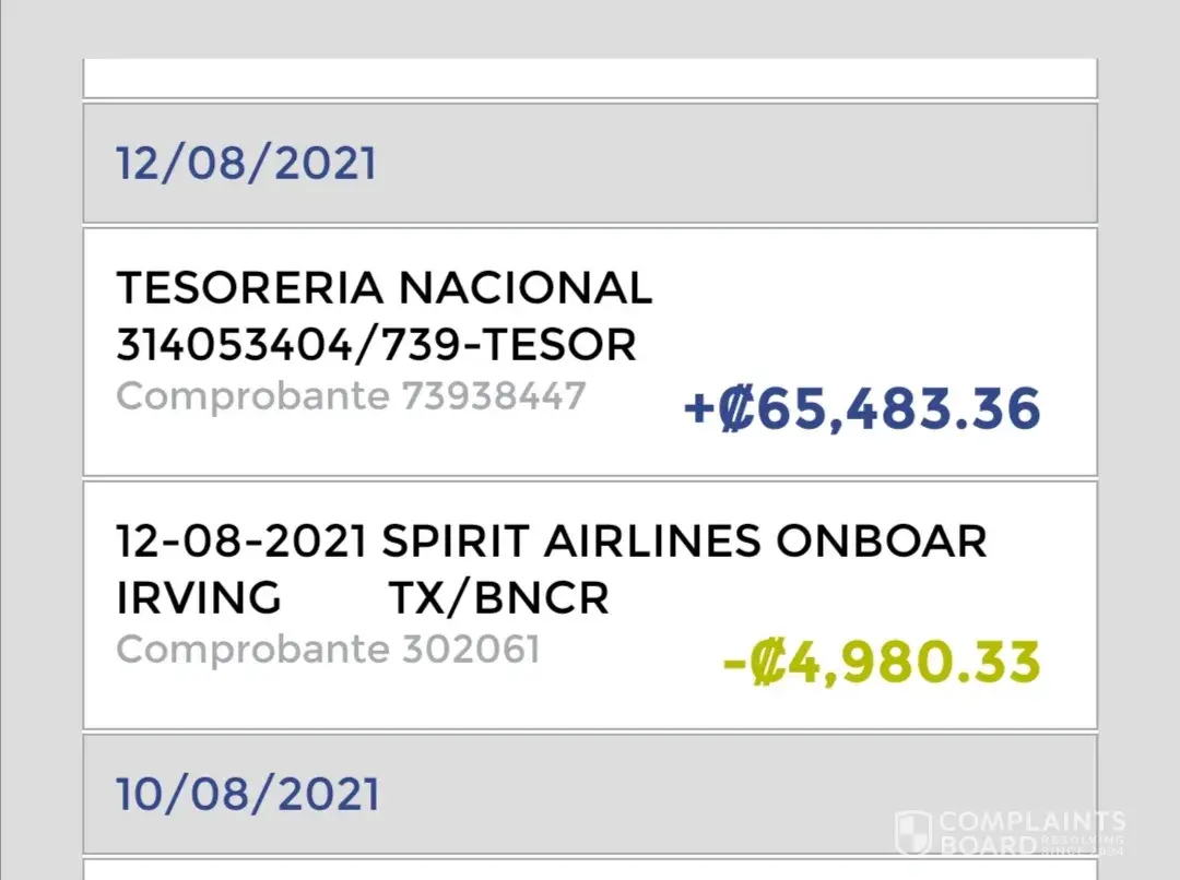 El dÃa de ayer 12 de agosto 2021 me llego un rebajo de spirit airlines on boar irvin tx comprobante 302061 y no he viajado con spirit desde abril, necesito una explicación sobre esto y que se me reintegre el dinero.