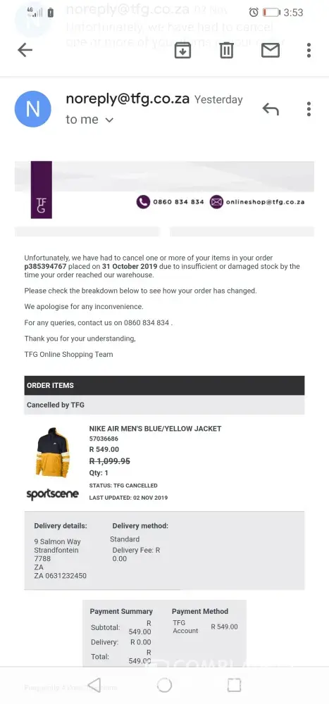 I purchased a the Nike Air men's blue/yellow top on the 31 October 2019 only to be advised via via that the order has been canceled. Upon me calling the online support team I was told by one of the agents that when my order reached the warehouse the item was damaged. My question is who's fault is that because it resulted me having to re order the item. I would've loved to receive a call to confirm the above as the email is automated. I will never ever purchase from sportscene again! I suggest sportscene improves on providing a bit more information other than the email I received.
