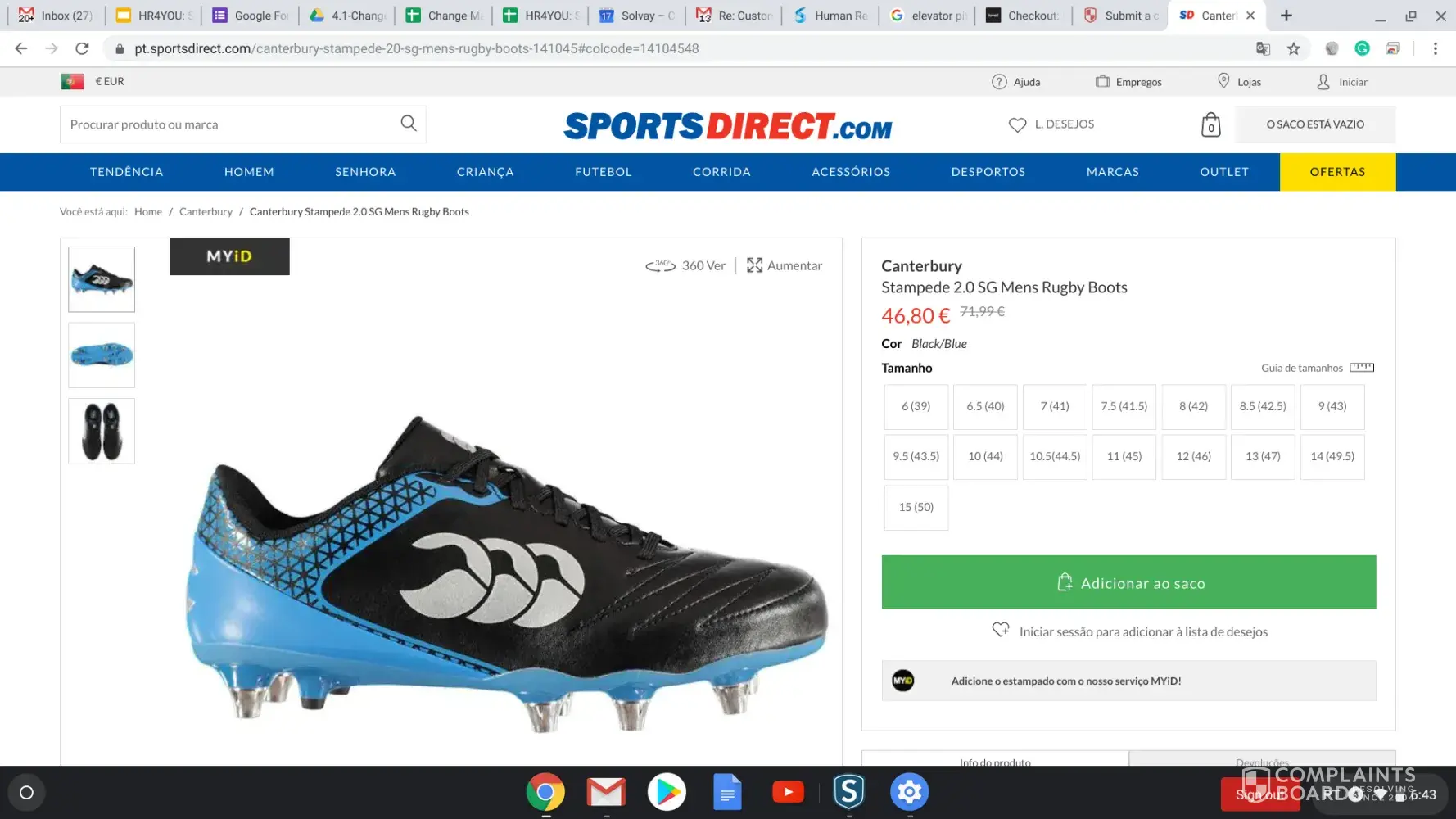 I ordered a pair of Rugby boots for my son on Sept 3rd picking the number 9.5 (43.5) from the size chart. I paid 10 € for transport + 46, 80.