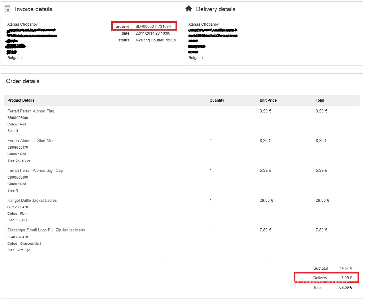 Two days after I have written about this problem to [protected]@SportsDirect.com (because I have never saw other method of contact with them) I noticed anoterh anomaly: The placed order (attachment_3.png) in status 'Awaiting Courier Pickup' seen in details now costs subtotal 62.56 EURO (attachment_4.png) as if I had chosen express delivery for 7.99 EURO. They have still not contacted me but I see a pathetic try to fix things up and make me bear the guilt.