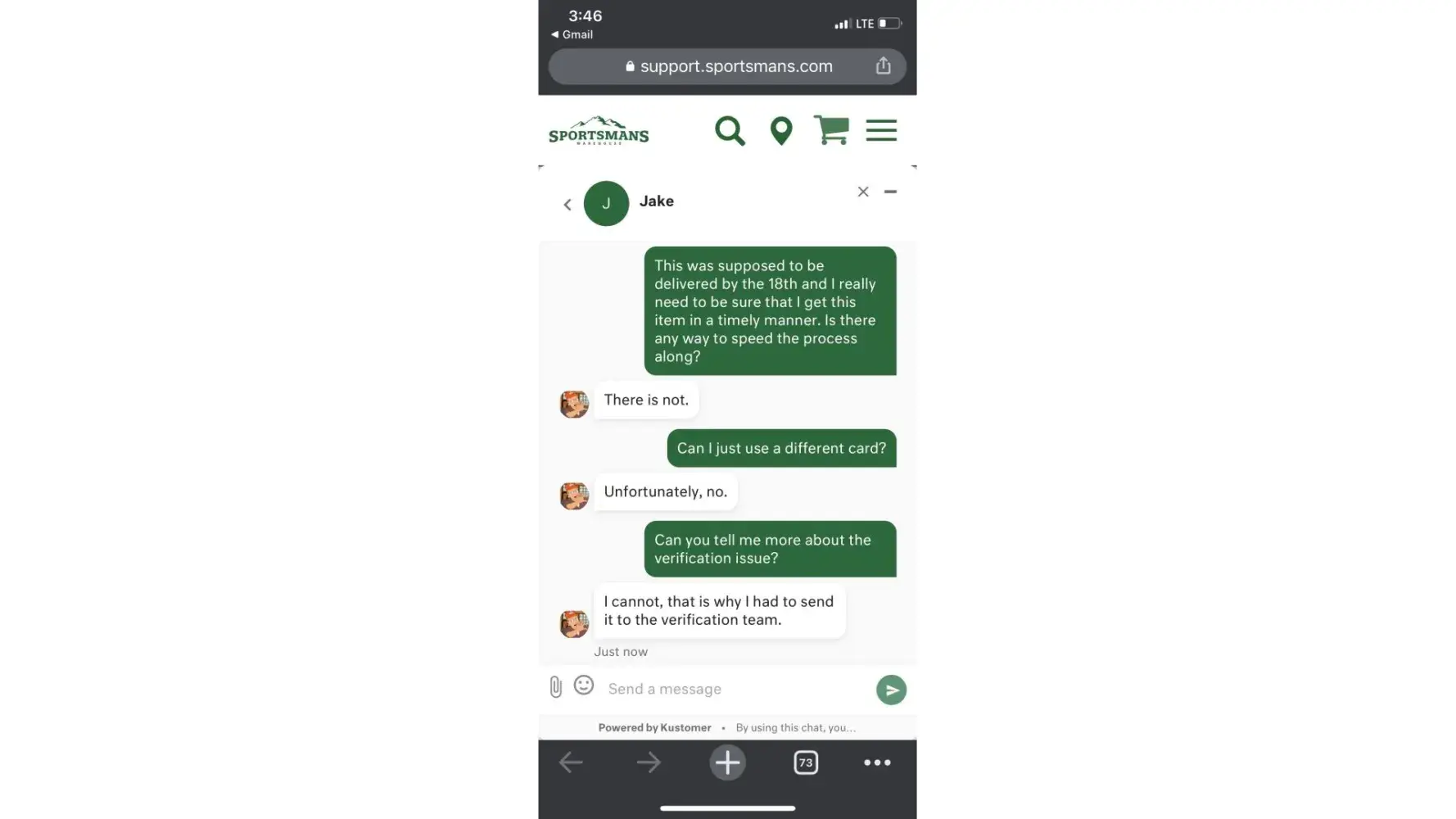 I reached out to customer support who advised that a "verification team" would contact me within 48 hours. Nobody ever did. I contacted customer support again who gave me the same message. A day later I get an email saying that I can't place online orders with Sportsmans and they will only let me buy items in store! No reason given.