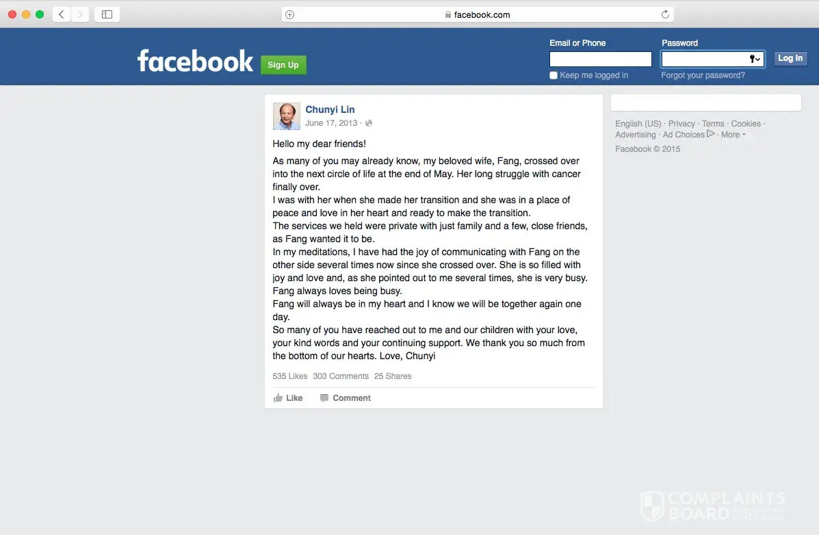 This is posted PUBLICLY on the Internationally Recognized Qigong Master's public profile. I took a screenshot. Many will view this as a "low blow" but the fact that he can't "completely heal" his very own wife demonstrates that he can't heal anyone going in to see him for cancer.